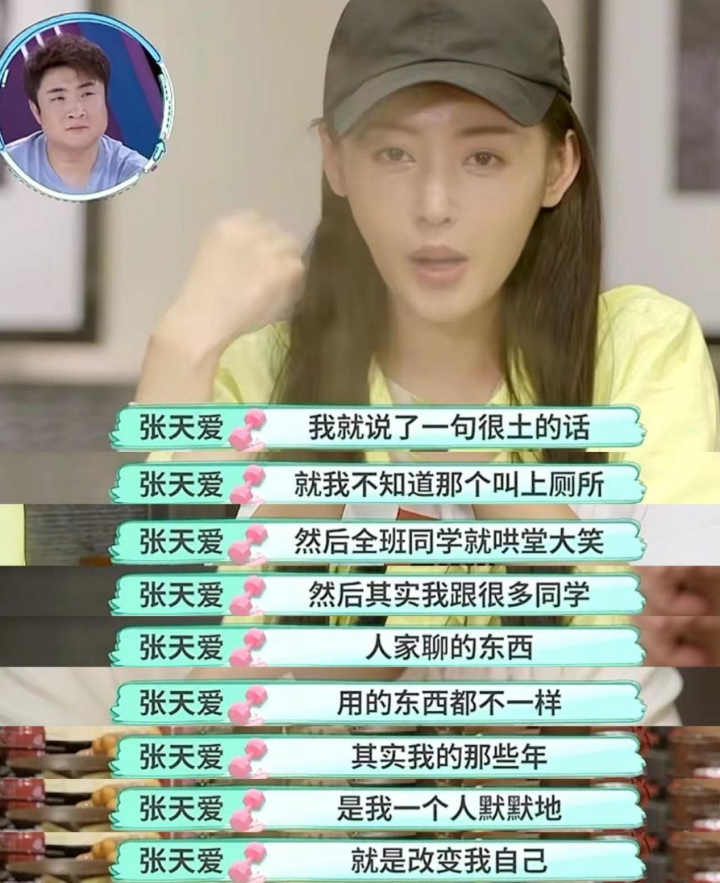 据张天爱在节目中回忆,为了融入同学,她默默丢掉自己的所有过往,不再说土话,也不再谈论自己喜欢的东西,而是学着迎合别人,了解他人喜欢谈论的东西。